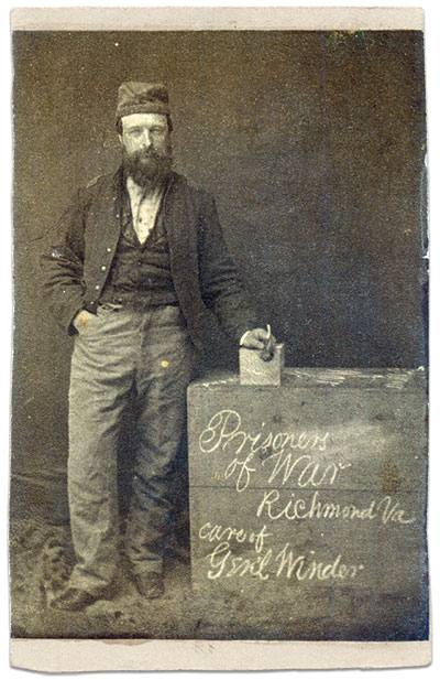 A pipe wielding, unnamed Union officer stands beside a large wood box, marked in chalk, “Prisoner of War Richmond Va care of Gen’l Winder.” A period pencil inscription on the back reads “Ypsi July 1863.” One theory holds that this officer hailed from Ypsilanti, Mich., and fell into enemy hands and was transported to Libby Prison, Castle Thunder or Belle Isle. The date suggests his possible capture during the Battle of Gettysburg.