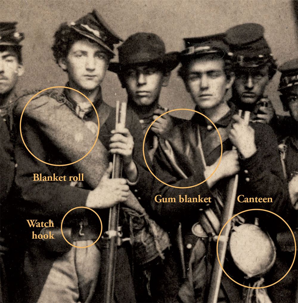 The soldier next to our blanket roll subject is wearing what appears to be the army issue gum blanket in over the shoulder blanket roll fashion. On top of this there is the three-pint M1858 “smooth side” canteen without its fabric covering.