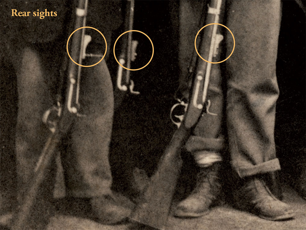 This difference lies in a very slight variation in the rear sight configuration. The U.S. Model 1842 long-range rear sight had much higher sidewall profile than the rear sight used on the Model 1842 smoothbore muskets, which were rifled and sighted by Miles Greenwood of Cincinnati, Ohio. In late 1861 the government contracted with Greenwood to provide 3,000 rifled muskets to the state of Indiana. It is important to note that while Greenwood would rifle more than 25,000 Model 1816/22 and M1842 smoothbore muskets, only 20 percent would be equipped with long range rear sights. This makes identifying Greenwood rifled arms in period images extremely difficult because they may appear to be smoothbore rifle muskets.