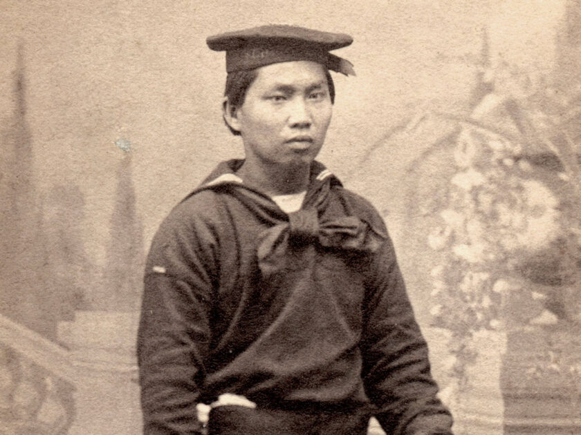 Western campaigners, one wearing an identification badge and another with a cigar, posed in Kentucky towards the war’s end. A U.S. sailor of Asian heritage posed for his likeness in